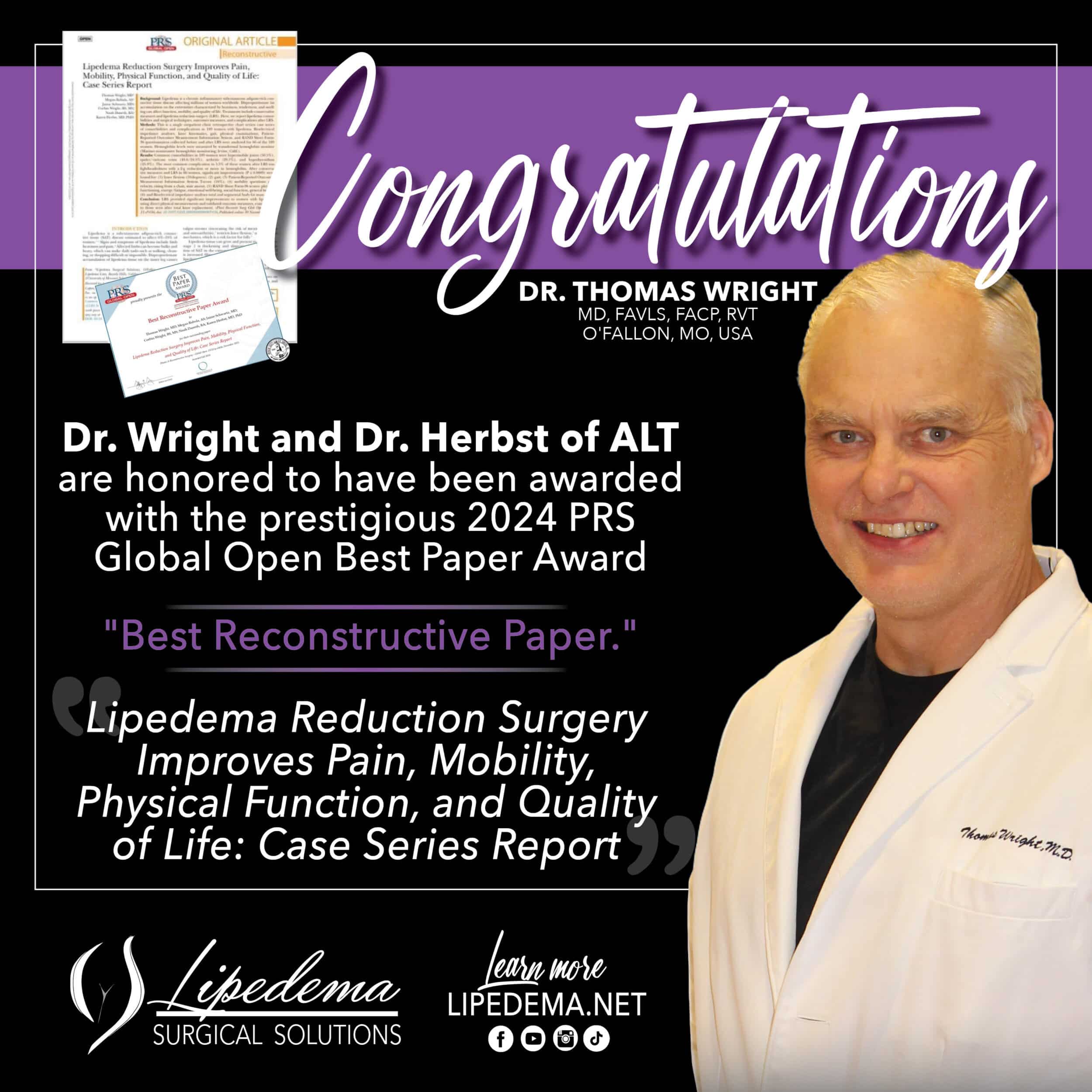 Dr. Thomas Wright, a leading expert in the field of lipedema treatment, along with his esteemed co-authors, is proud to announce that their manuscript, “Lipedema Reduction Surgery Improves Pain, Mobility, Physical Function, and Quality of Life: Case Series Report,” has been awarded the 2024 PRS Global Open Best Paper Award for “BEST RECONSTRUCTIVE PAPER.”