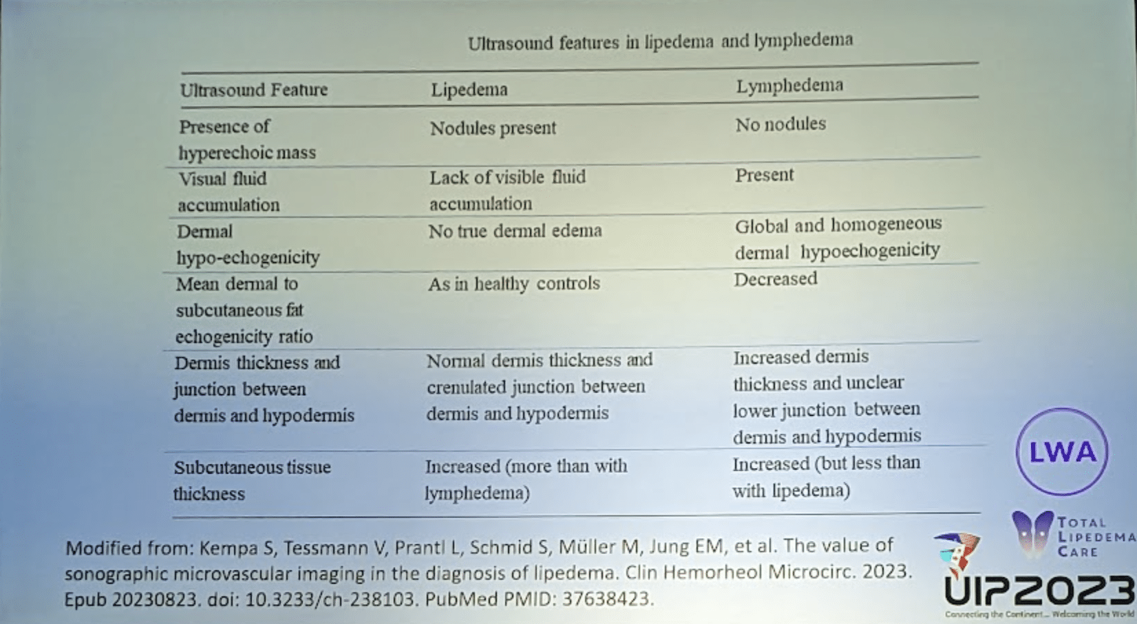 Diagnosing lymphedema and lipedema is mainly clinical. Both involve a physical examination and medical history. The diagnosis of Lymphedema may be helped through imaging tests, such as an ultrasound or MRI, to check for blockages in the lymphatic system. However, the sensitivity of the imaging tests do not easily pick up early Lymphedema. Lipedema is typically diagnosed through a physical exam; however, ultrasound and ruling out other causes are required. Lymphedema, as a lymphatic disease, shares similarities with lipedema diagnosis, but ultimately requires different treatment for successful patient care. Women with lipedema and lymphedema both experience excessive fluid in the affected areas, namely the limbs in both diseases, however, lymphedema patients tend to have much more fat in the body. Lymphedema presents early on with excessive fluid in the affected areas, and as muscles atrophy over time, they begin to turn into fat. Additionally, the tell-tale sign of lymphedema is that the limbs are affected disproportionately – the slide of the arm cross-section below shows the left vs. right arm, with the right affected by lymphedema and experiencing a higher fat level than the left. The second slide of MRI is that of a patient with lipedema. Not only is the fat content lower, but the legs are affected proportionately, rather than one greater than the other.